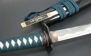 La montatura della katana è costituita da impugnatura (tsuka), elsa o guardia (tsuba) (鍔) e fodero (saya) (鞘) . L'impugnatura in legno era ricoperta di pelle di razza (same), rivestita con una fettuccia di seta intrecciata (tsukaito); tra i vari intrecci del cordone di seta, trovano posto degli ornamenti di svariate fogge (menuki) questi potevano poi trovarsi anche sulle impugnature rivestite di altri materiali. Il fodero era realizzato in legno di magnolia laccato. La tsuba, posta tra il manico e la lama per evitare le lesioni alle mani da scivolamenti sulla lama, era metallica, finemente intagliata, spesso un'opera d'arte. TsubaLa lama vera e propria invece si divide in codolo (Nakago), corpo della lama e punta (Kissaki). Vista invece dal dorso al tagliente la lama si divide in: Mune: il dorso della lama. Può essere distinto in vari tipi: Hikushi 'basso', Takashi 'alto', Mitsu 'a tre lati', Hira o Kaku 'piatto', Maru 'arrotondato'; shinogi-ji: il primo dei due piani che formano la guancia della lama, lucidato a specchio. Su di esso di possono trovare profonde incisioni longitudinali, solitamente sul primo terzo della lama, rappresentanti disegni (horimono) o caratteri sanscriti (bonji). Sempre su di esso può essere presente un solco da entrambi i lati (Hi) il cui fine principale è l'alleggerimento ed un ulteriore bilanciamento della lama; Shinogi: Linea di divisione tra i piani. Nella forma di lama denominata shinogi-zukuri, dopo il cambio di piano del kissaki determinato dalla linea di yokote, lo shinogi prende il nome di ko-shinogi; Il secondo dei due piani che formano la guancia della lama (Hira), non lucidato per permettere la struttura della lama (Hada); Linea di tempra (Hamon) Parte temprata ed affilata (Ha